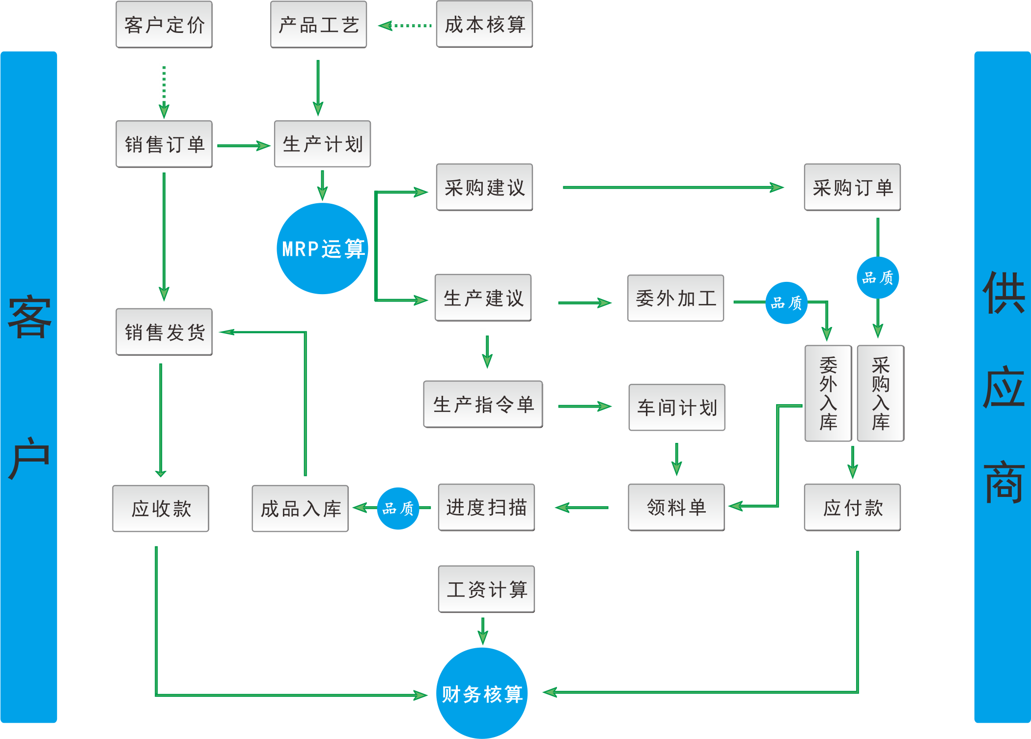 采用条码枪、PDA等电子产品,支持按指令单、按流程卡、外箱贴等扫描方式,从物料到半成品到成品的整体条码解决方案。
